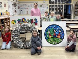Die ehemalige Klasse 4c gestaltete unser Schullogo für den Wettbewerb. Grundlage dafür war Müll, den die Kinder über mehrere Wochen auf unserem Pausenhof gesammelt und anschließend sortiert und verarbeitet haben.
