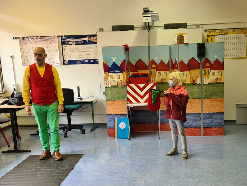 Am Freitag, 05.11.2021 besuchte Robert Mateau von der Kinderverkehrsbühne NRW die Erstklässler aller drei Standorte. Bereits in den ersten Minuten seines Auftritts gelang es dem Verkehrszauberer die aufgeregten Mädchen und Jungen völlig in seinen Bann zu ziehen und aktiv mit einzubinden: So halfen alle Kinder gemeinsam mit Zauberluftpumpen aus, als der Zauberstab des Zauberers unter allgemeinem Gelächter seinen Dienst versagte, warnten Herrn Mateau zuverlässig, wenn die Zauberampel „rot“ zeigte – denn dann darf nicht gezaubert werden – und sprangen als Zauberassistenten mit ein. Immer wieder brachen die Kinder in schallendes Lachen aus: Zu lustig war es, wenn die Zauberutensilien sich scheinbar selbstständig machten und beispielsweise nach und nach offenbar unkontrolliert rote, gelbe und grüne Tücher aus den Hosentaschen des Verkehrszauberers ploppten oder bei der gemeinsamen Zauberei die Ampeltücher nicht verschwunden, dafür aber auf einmal miteinander verknotet waren. Ehrfürchtiges Schweigen herrschte als die Kinder kurz glaubten, einen Zaubertrick durchschaut zu haben, Hund Sam dann aber vom Zauberer schon längst aus dem Auto in seine Hundehütte gezaubert worden war. Ganz nebenbei wiederholten und übten die Kinder im ca. 40-minütigen Auftritt des Zauberers mit ihm das richtige Verhalten an Fußgänger-Ampeln und Zebrastreifen, erfuhren, dass der sicherste Platz im Auto immer hinten ist und wie lange man einen Kindersitz braucht. Den Besuch des Verkehrszauberers in Alme, Thülen und Hoppecke haben die Volksbanken des HSK durch ihre großzügige Unterstützung möglich gemacht. Vielen Dank!